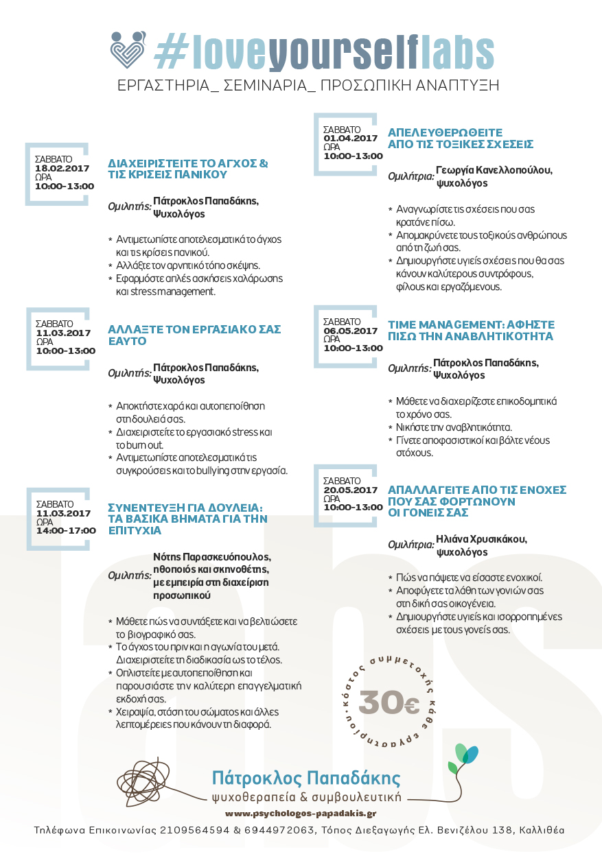 Δείτε τις αφίσες από τα εργαστηρία/σεμινάρια #loveyourselflabs μέχρι σήμερα.